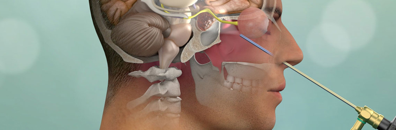 Endoscopic surgery is performed through the nose to remove tumors from the pituitary gland and skull base. In this minimally invasive surgery, the surgeon works through the nostrils with a tiny endoscope camera and light to remove tumors with long instruments. Pituitary tumors can cause hormone problems and vision loss. Tumor removal often reverses vision problems and restores normal hormone balance.