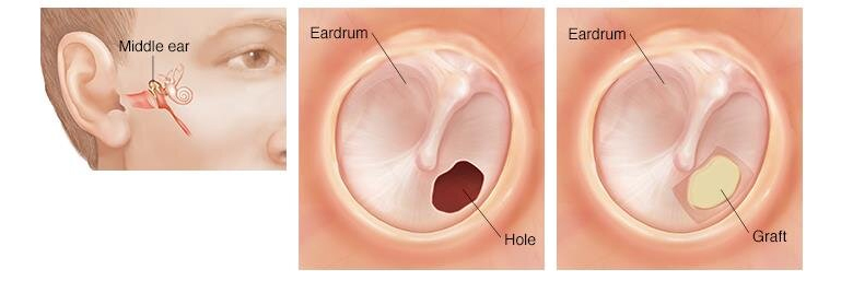 Tympanoplasty is the surgical operation that is performed to reconstruct the eardrum or the small bones of the middle ear. The goal of this surgical procedure is to close the perforation and also to improve hearing.